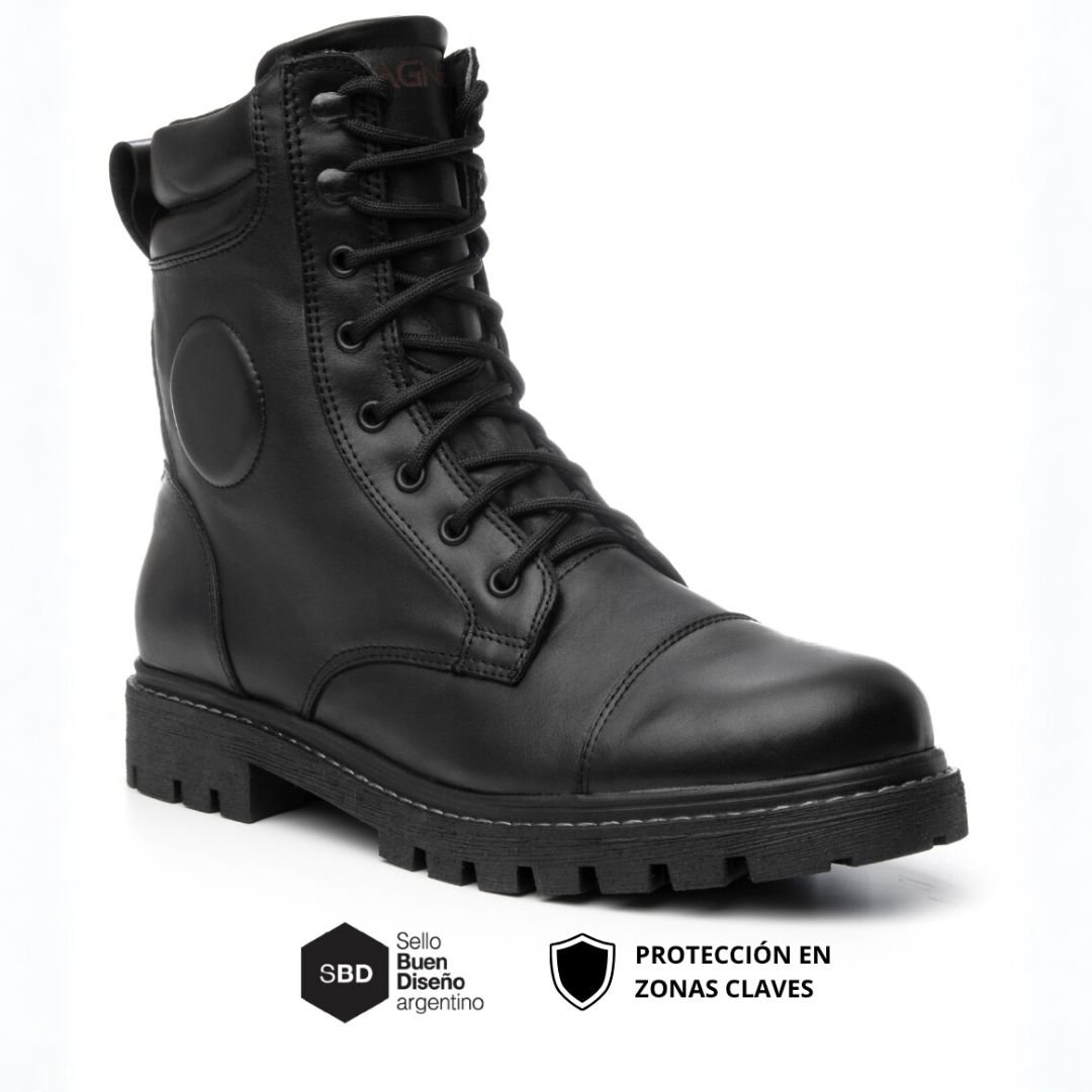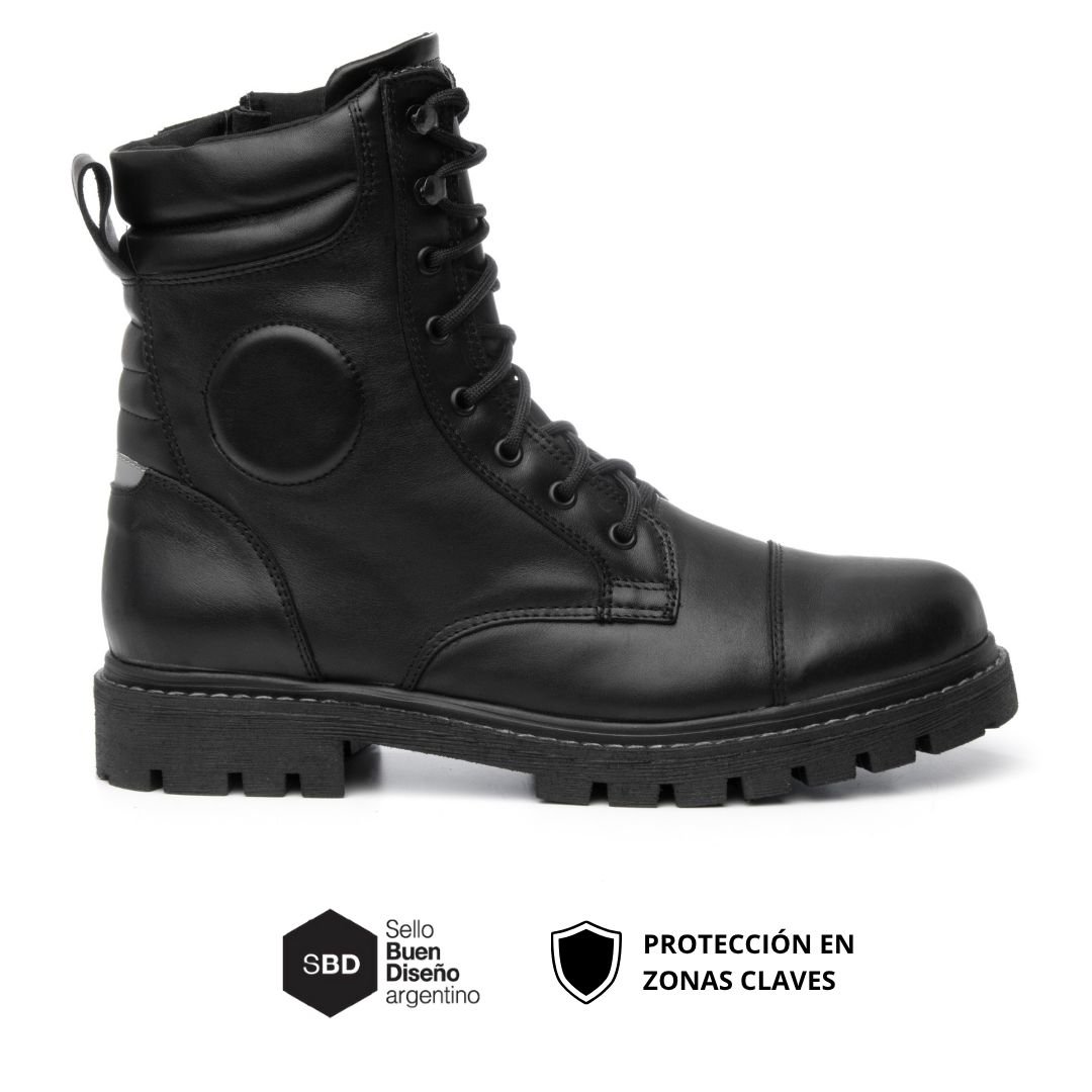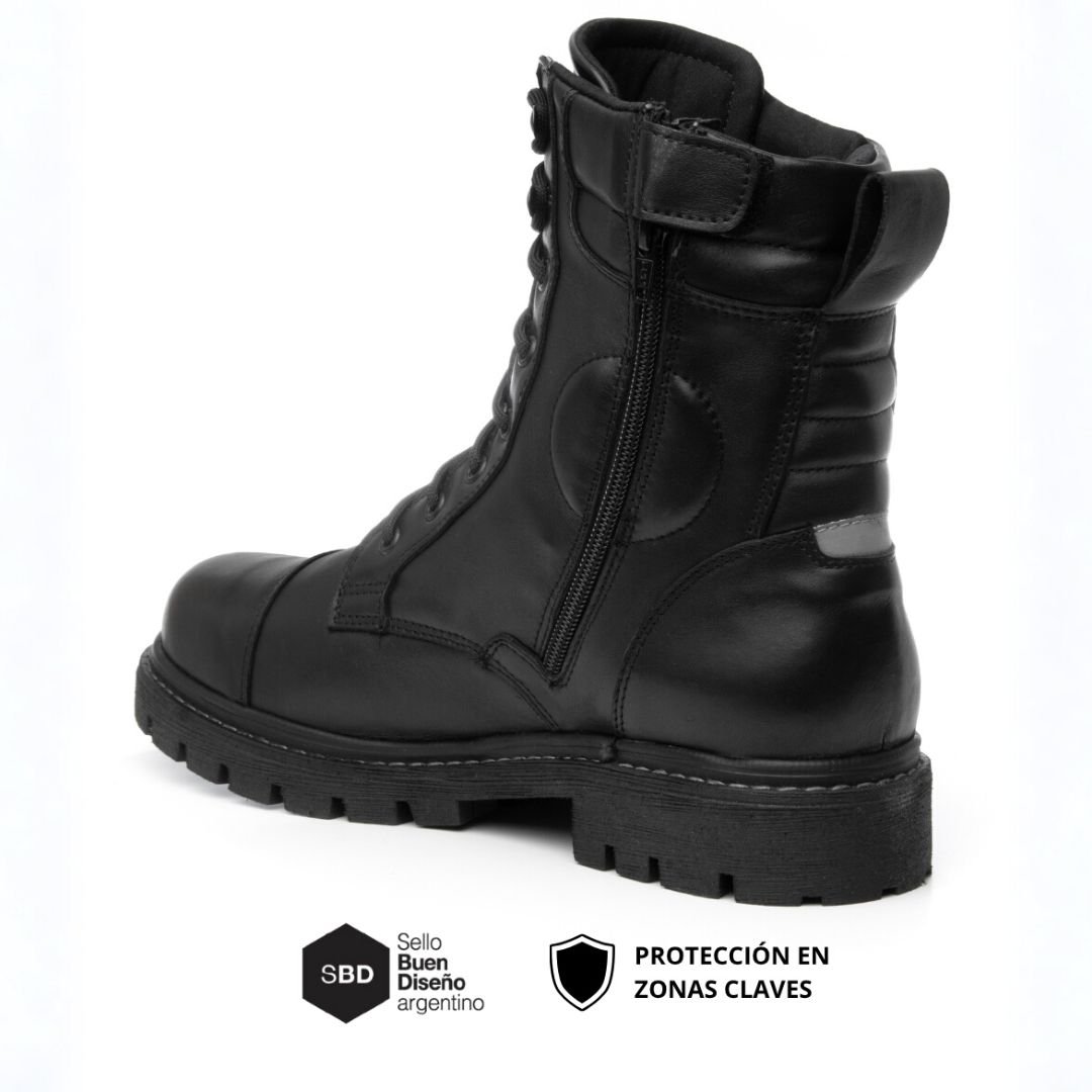 Bota touring con Kevlar®, ripstop impermeable, reflectivo 3M 300 lm y Suela antifatiga. Cierre lateral con trampa de agua. Cuero premium.